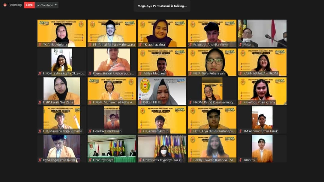 Universitas Jayabaya sukses menyelenggarakan Pelantikan Mahasiswa Baru Tahun Akademik 2021/2022 secara virtual pada Kamis, 2 September 2021. Meskipun digelar secara daring, acara ini tetap berlangsung dengan khidmat, penuh semangat, dan sarat makna bagi seluruh peserta yang baru memulai perjalanan akademik mereka.