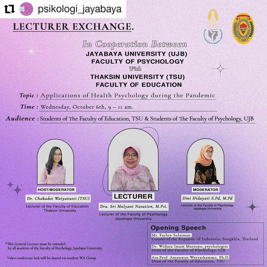 Lecture Exchange antara Fakultas Psikologi Universitas Jayabaya dengan Thaksin University, Thailand