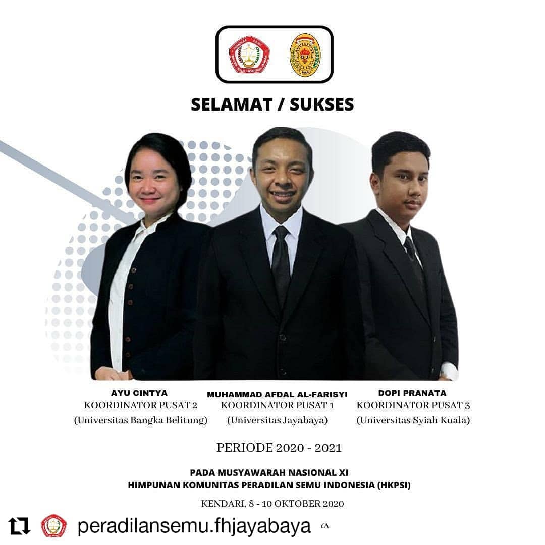 Selamat kepada Muhammad Afdhal Alfarisyi, mahasiswa Fakultas Hukum Universitas Jayabaya, yang berhasil terpilih sebagai Koordinator 1 Himpunan Komunitas Peradilan Semu Indonesia (HKPSI) periode 2020–2021.