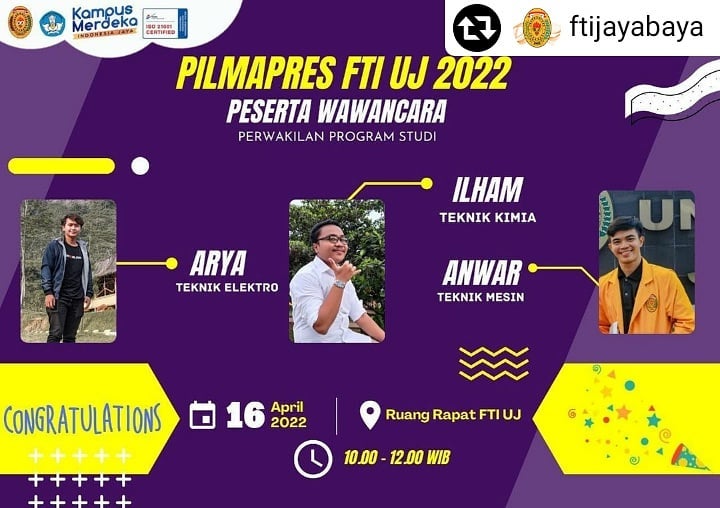 FTI UJ kembali menyelenggarakan Pilmapres 2022, kompetisi bergengsi untuk mengapresiasi mahasiswa terbaik di bidang akademik dan non-akademik. Kegiatan ini memberi kesempatan bagi mahasiswa berprestasi untuk menunjukkan kemampuan, gagasan kreatif, serta kompetensi bahasa Inggris melalui presentasi video.