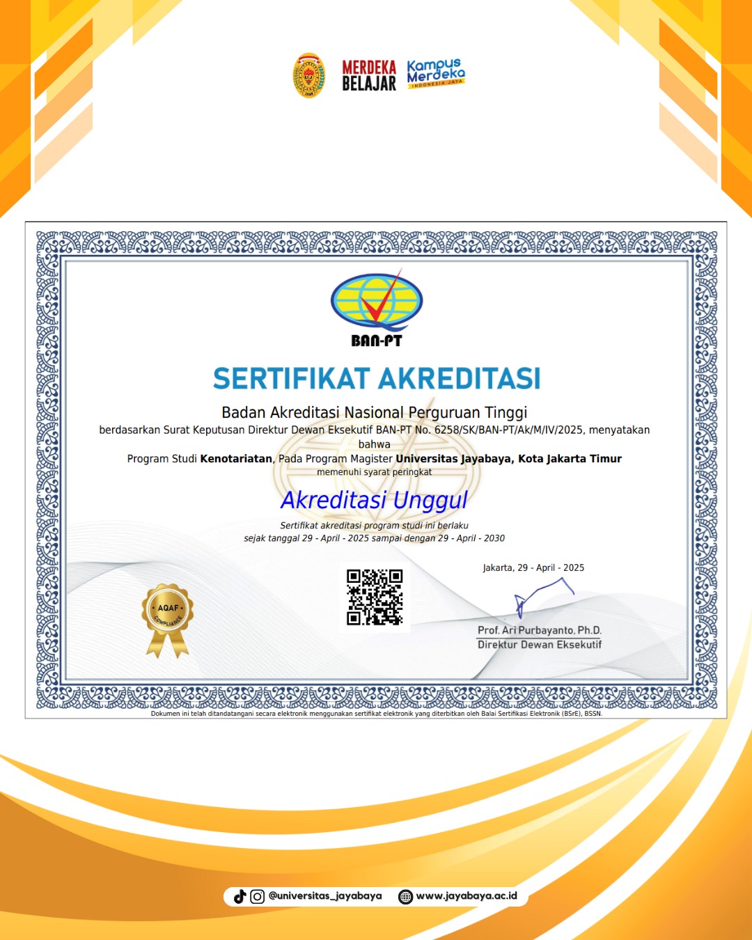 Apresiasi yang sebesar-besarnya kami sampaikan kepada Program Studi Kenotariatan Program Magister Universitas Jayabaya atas keberhasilan meraih Akreditasi Unggul dari BAN-PT. Pencapaian ini menunjukkan dedikasi tinggi seluruh dosen, mahasiswa, tenaga kependidikan, serta para pemangku kepentingan dalam menjaga kualitas akademik dan profesionalisme.