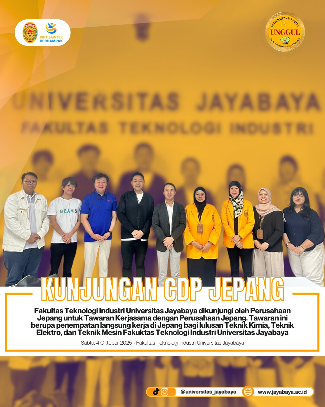 Pada Sabtu, 4 Oktober 2025, Fakultas Teknologi Industri (FTI) Universitas Jayabaya menerima kunjungan khusus dari Jepang terkait peluang kerja bagi lulusan Teknik Kimia, Teknik Elektro, dan Teknik Mesin.