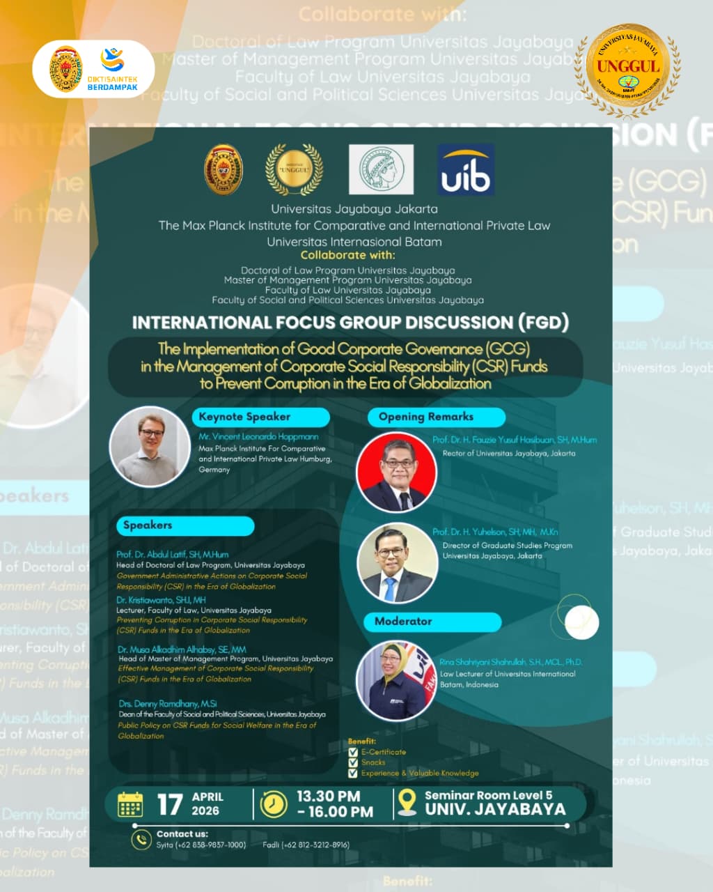 FGD Internasional ini menghadirkan para Speakers berkelas di bidangnya yaitu sebagai Speakers adalah : Prof. Dr. Abdul Latif, S.H., M.Hum., (Head of Doctoral of Law Program, Universitas Jayabaya) dengan judul paparan : "Government Administrative Actions on Corporate Social Responsibility (CSR) in the Era of Globalization"